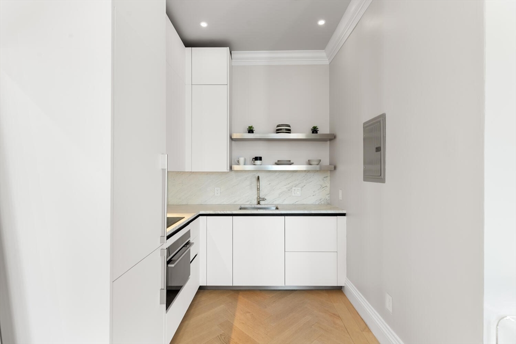 Residence 410 at the Vendome is a sun-drenched, fully renovated studio offering a sophisticated pied-a-terre within one of Boston's most iconic historic buildings. Oversized bay windows set along a graceful curved wall frame open skyline views and flood the home with natural light. The meticulously designed interior features wide-plank white oak herringbone flooring, custom European cabinetry, and a sleek chef's kitchen appointed with marble countertops and integrated high-end Fisher & Paykel appliances. A marble fireplace with electric insert adds warmth and architectural character, while a custom built-in closet, travertine stone bath, smart-home technology, and electric shades complete this turnkey residence. The Vendome offers 24/7 concierge service and professional on-site management, all just moments from Newbury Street, the Commonwealth Ave Mall, Copley Square, and the Boston Public Garden - an exceptional opportunity to own a refined urban retreat in the heart of Back Bay.