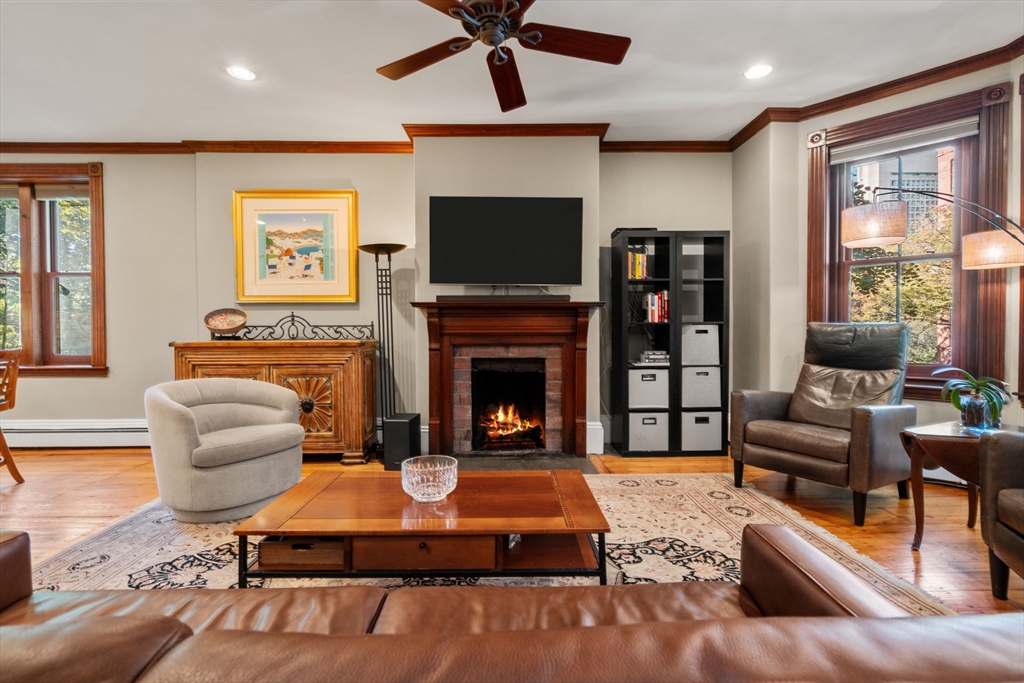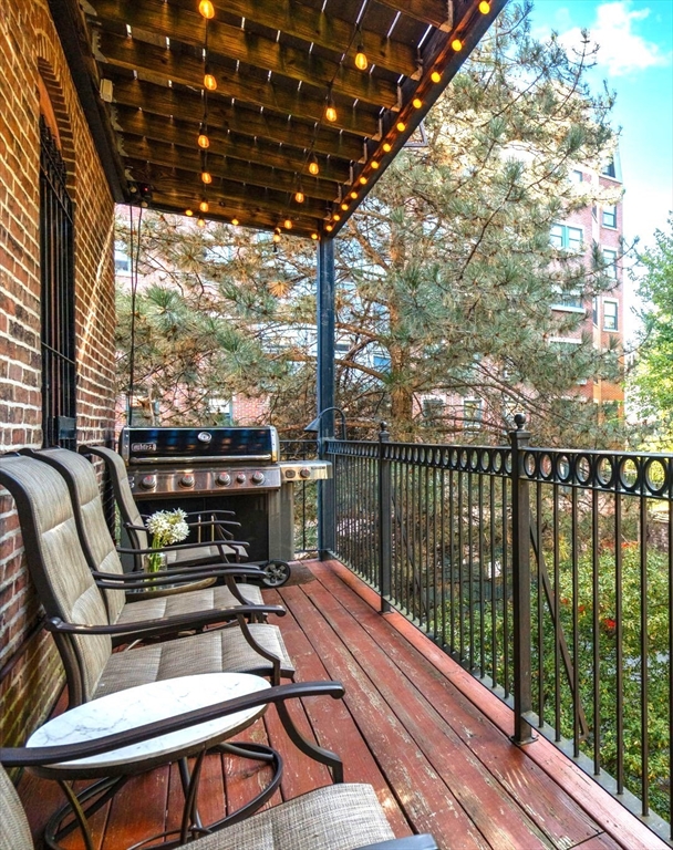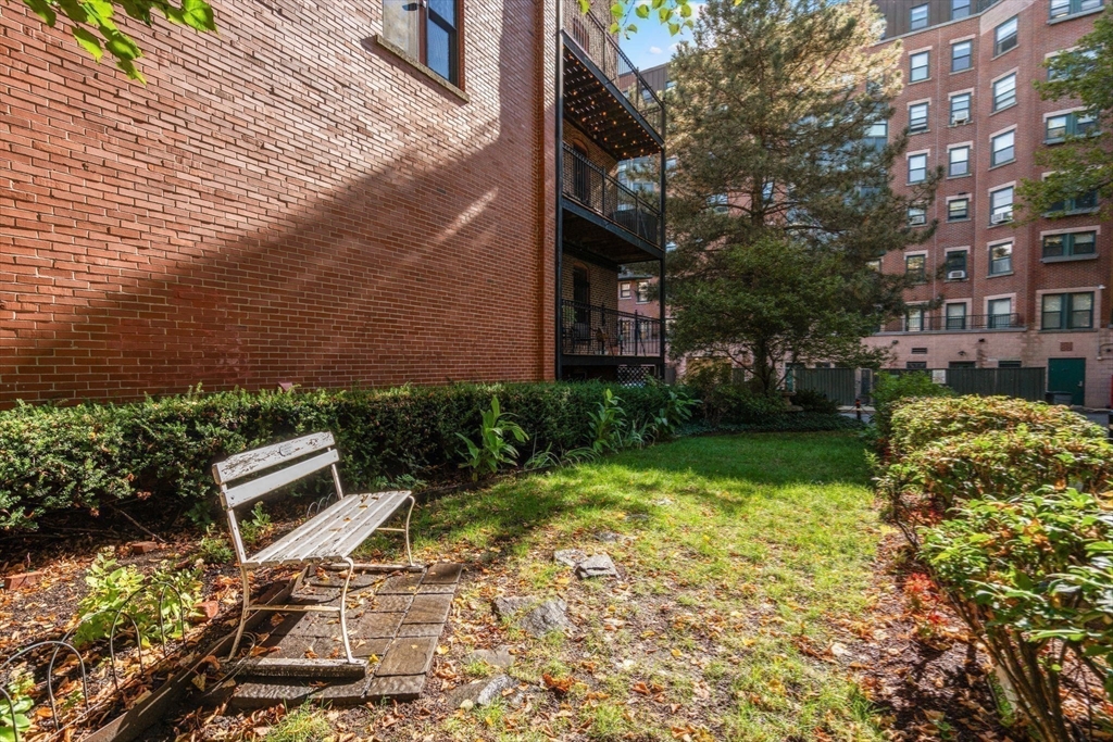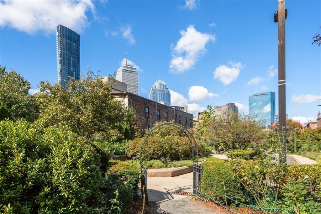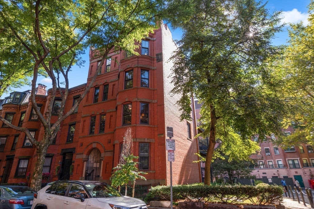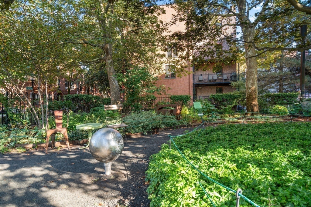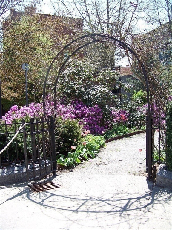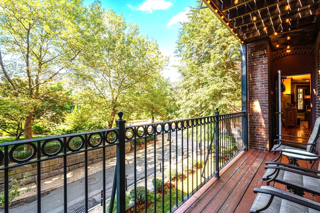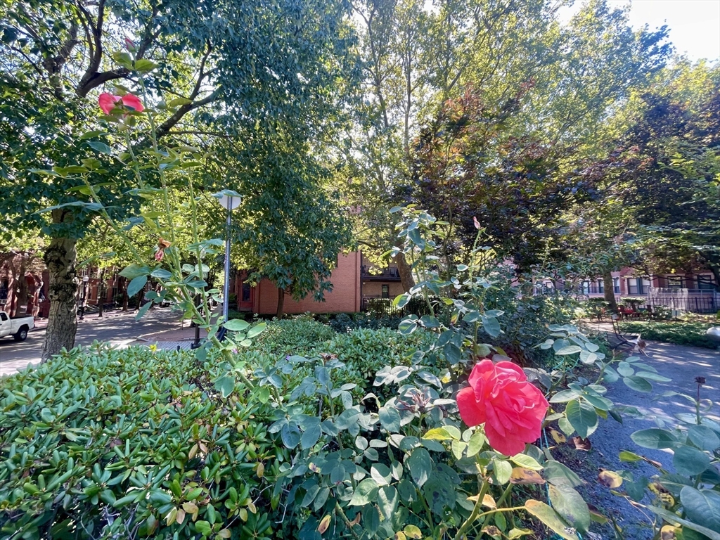 New Listing! South End. On The Park. Parking included. Wonderful Deck. Spectacular Rare Corner home with 13 windows + 3 exposures providing beautiful natural light. This home overlooks the Rose Garden at the Southwest Corridor Park. From the deck enjoy dining al fresco + morning coffee. Inviting living room, perfect for entertaining, with tall ceilings, wood floors, fireplace + a separate dining area which could also be used as a home office. Sleek Open plan kitchen w/ breakfast bar, stainless steel appliances, including gas cooking, stone countertops/breakfast bar + plenty of cabinetry/work surfaces. Stunning bathroom with custom tile work, tub + modern fixtures. In unit washer/dryer. Great closets including two walk ins. Additional bonus storage in basement. Picturesque leafy street with brick sidewalks & historic street lamps. Live in the exciting South End neighborhood near restaurants, shopping, green spaces + more.