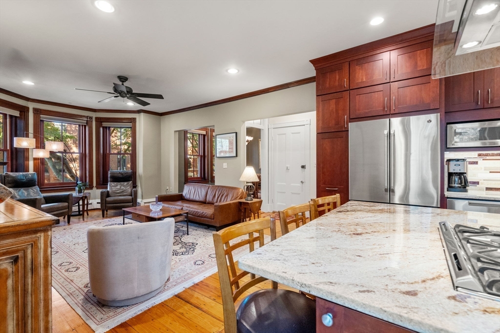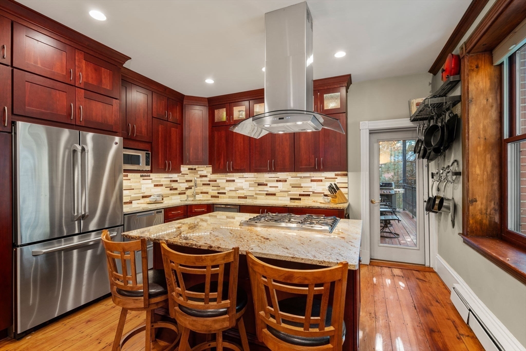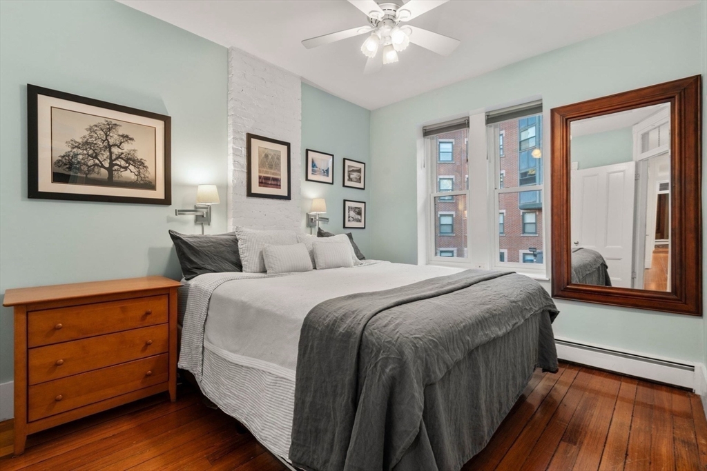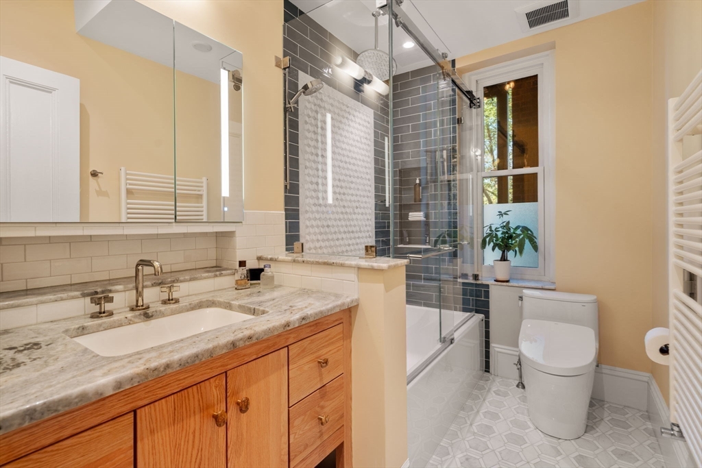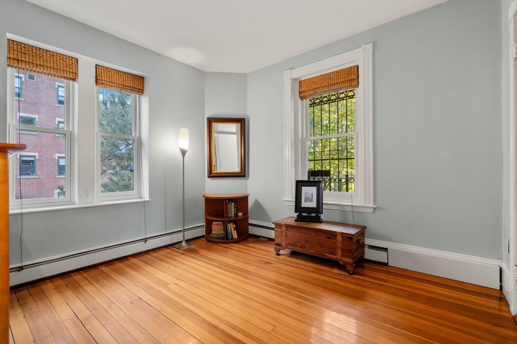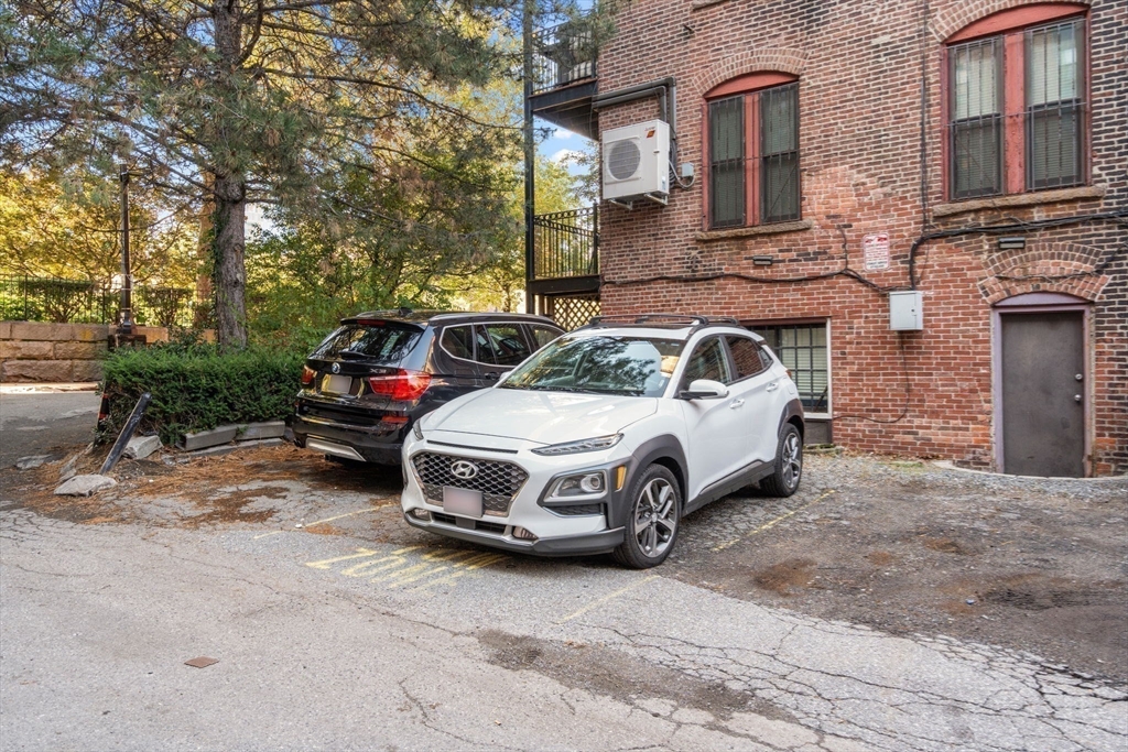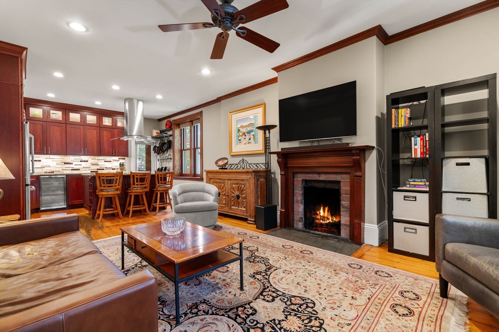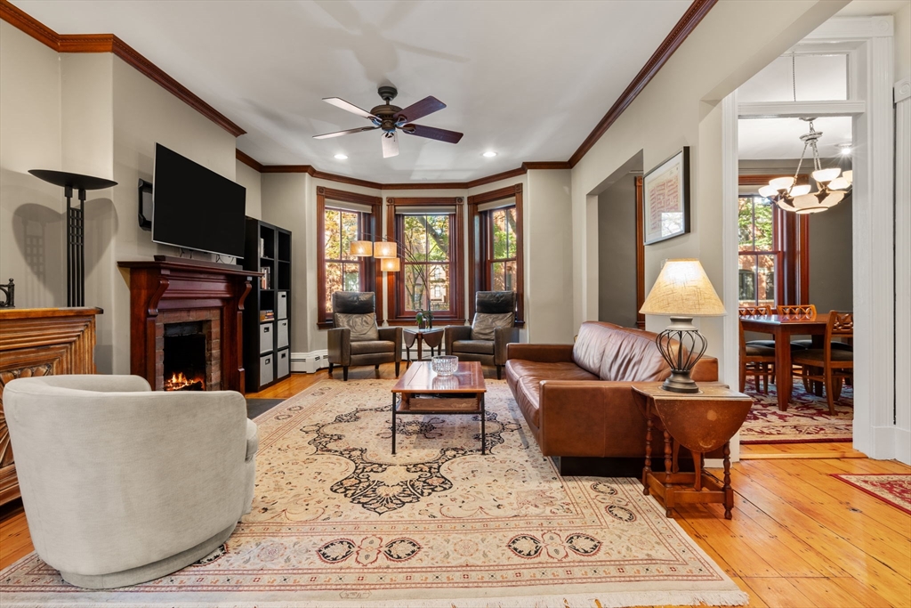 New Listing! South End. On The Park. Parking included. Wonderful Deck. Spectacular Rare Corner home with 13 windows + 3 exposures providing beautiful natural light. This home overlooks the Rose Garden at the Southwest Corridor Park. From the deck enjoy dining al fresco + morning coffee. Inviting living room, perfect for entertaining, with tall ceilings, wood floors, fireplace + a separate dining area which could also be used as a home office. Sleek Open plan kitchen w/ breakfast bar, stainless steel appliances, including gas cooking, stone countertops/breakfast bar + plenty of cabinetry/work surfaces. Stunning bathroom with custom tile work, tub + modern fixtures. In unit washer/dryer. Great closets including two walk ins. Additional bonus storage in basement. Picturesque leafy street with brick sidewalks & historic street lamps. Live in the exciting South End neighborhood near restaurants, shopping, green spaces + more.