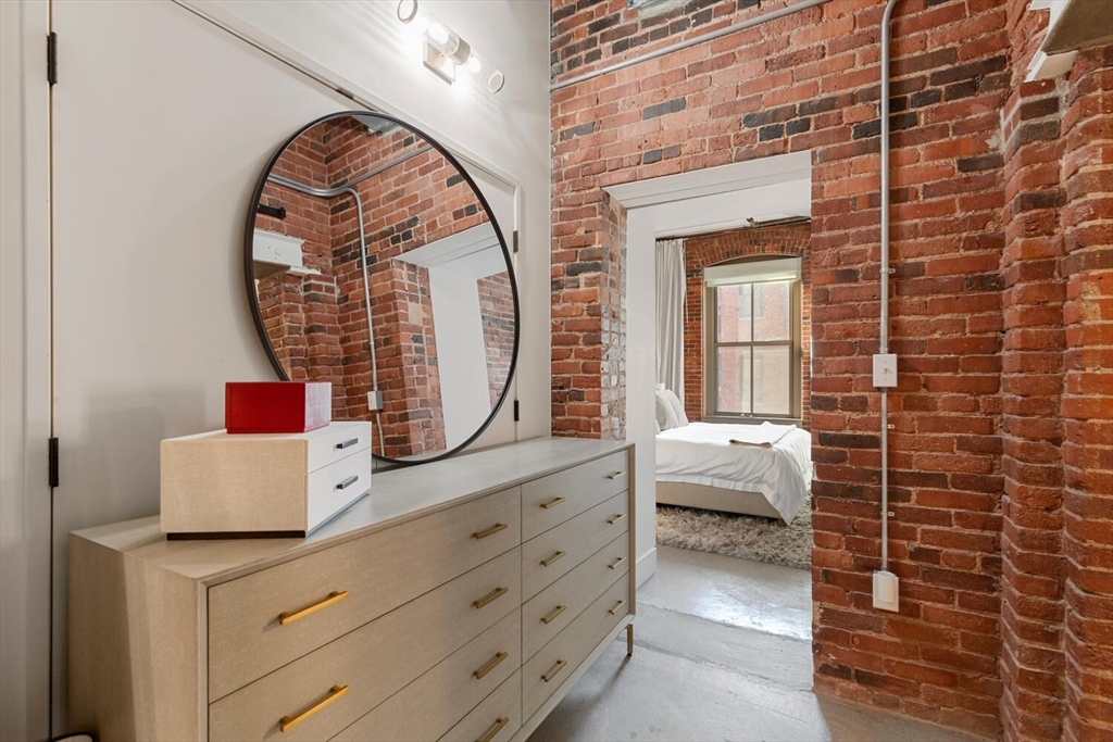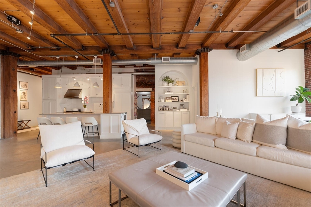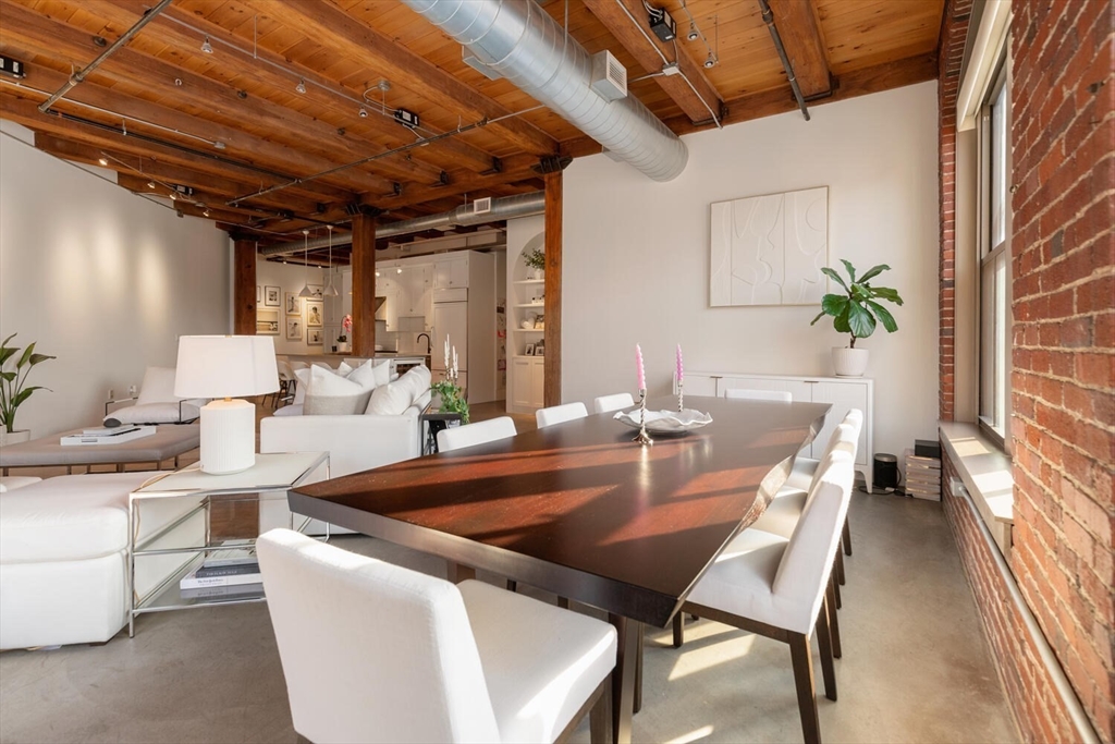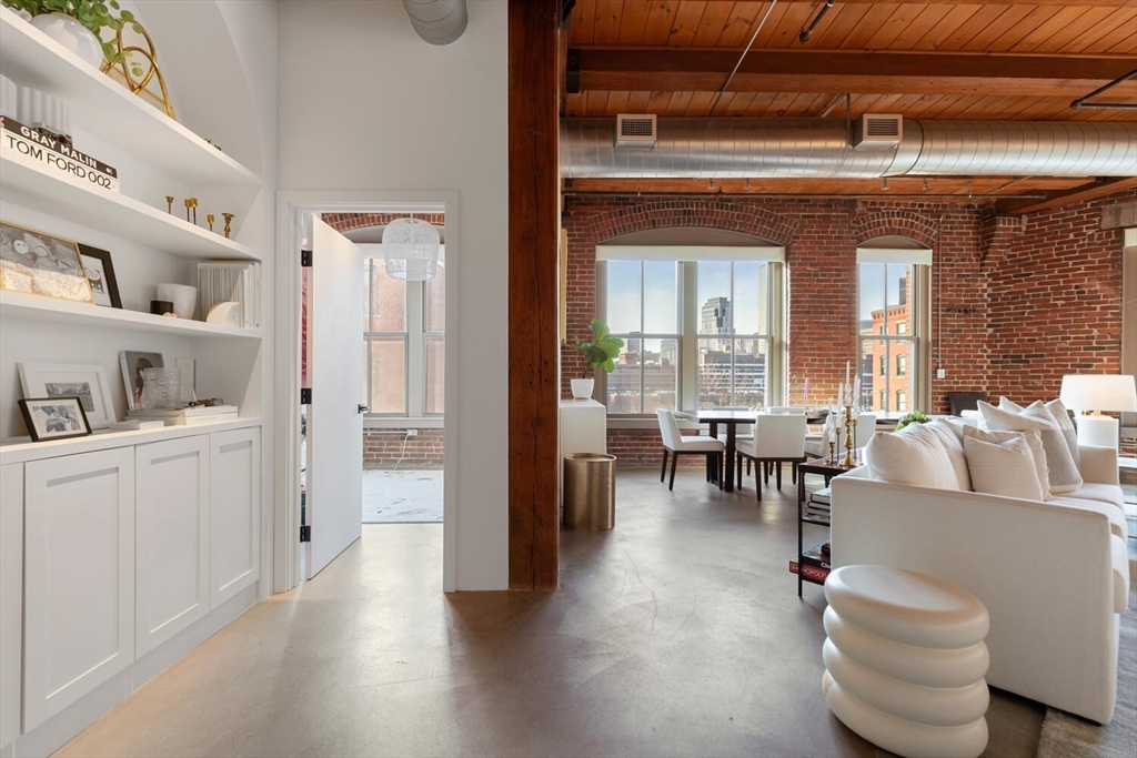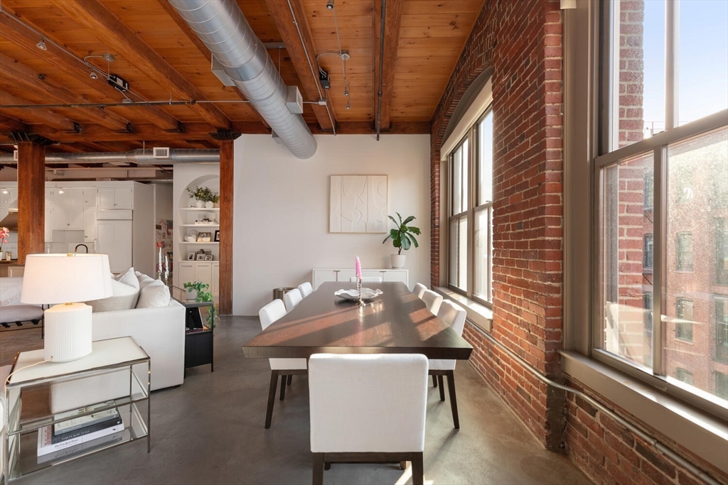 Step into Unit 402 at 35 Channel Center, where loft living meets modern luxury. This 1,735 SF two-bedroom, two-bathroom home features soaring 12-foot ceilings, exposed brick, and polished concrete floors. The open-concept kitchen, living, and dining area is framed by large front-facing windows offering expansive skyline views. The custom chef's kitchen includes a Wolf range, integrated appliances, and sleek cabinetry. The primary suite, behind a striking brick archway, offers a walk-through closet and spa-like ensuite bath. The second bedroom is versatile, ideal for guests, a home office, or creative space. Located in a well-maintained elevator building with deeded garage parking, this home offers effortless city living in the heart of Fort Point--close to Trader Joe's, the Seaport, and the Financial District.