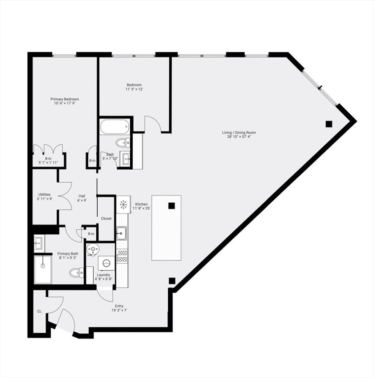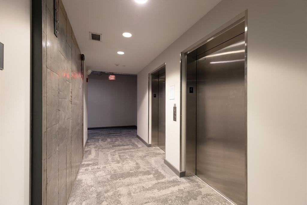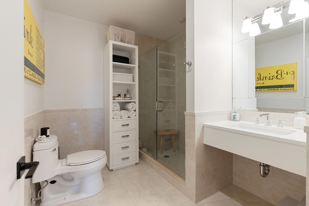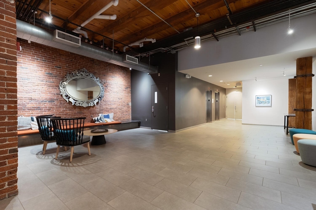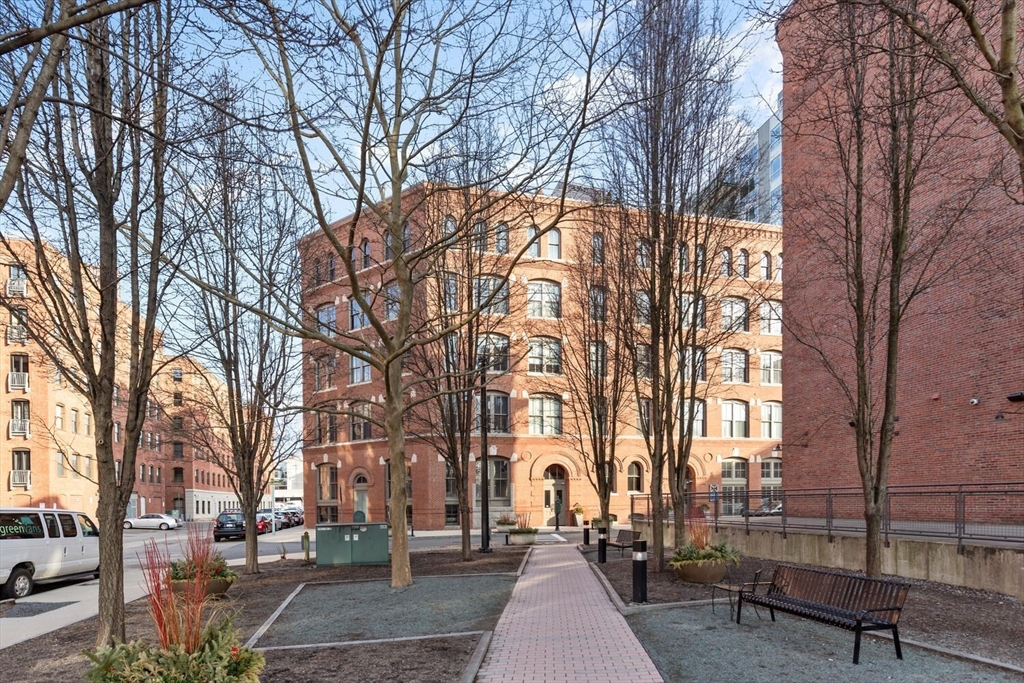 Step into Unit 402 at 35 Channel Center, where loft living meets modern luxury. This 1,735 SF two-bedroom, two-bathroom home features soaring 12-foot ceilings, exposed brick, and polished concrete floors. The open-concept kitchen, living, and dining area is framed by large front-facing windows offering expansive skyline views. The custom chef's kitchen includes a Wolf range, integrated appliances, and sleek cabinetry. The primary suite, behind a striking brick archway, offers a walk-through closet and spa-like ensuite bath. The second bedroom is versatile, ideal for guests, a home office, or creative space. Located in a well-maintained elevator building with deeded garage parking, this home offers effortless city living in the heart of Fort Point--close to Trader Joe's, the Seaport, and the Financial District.